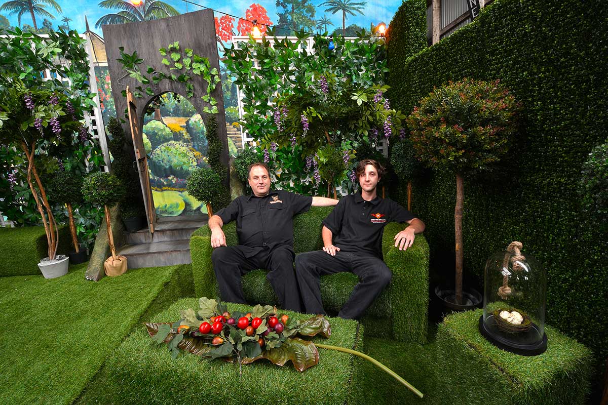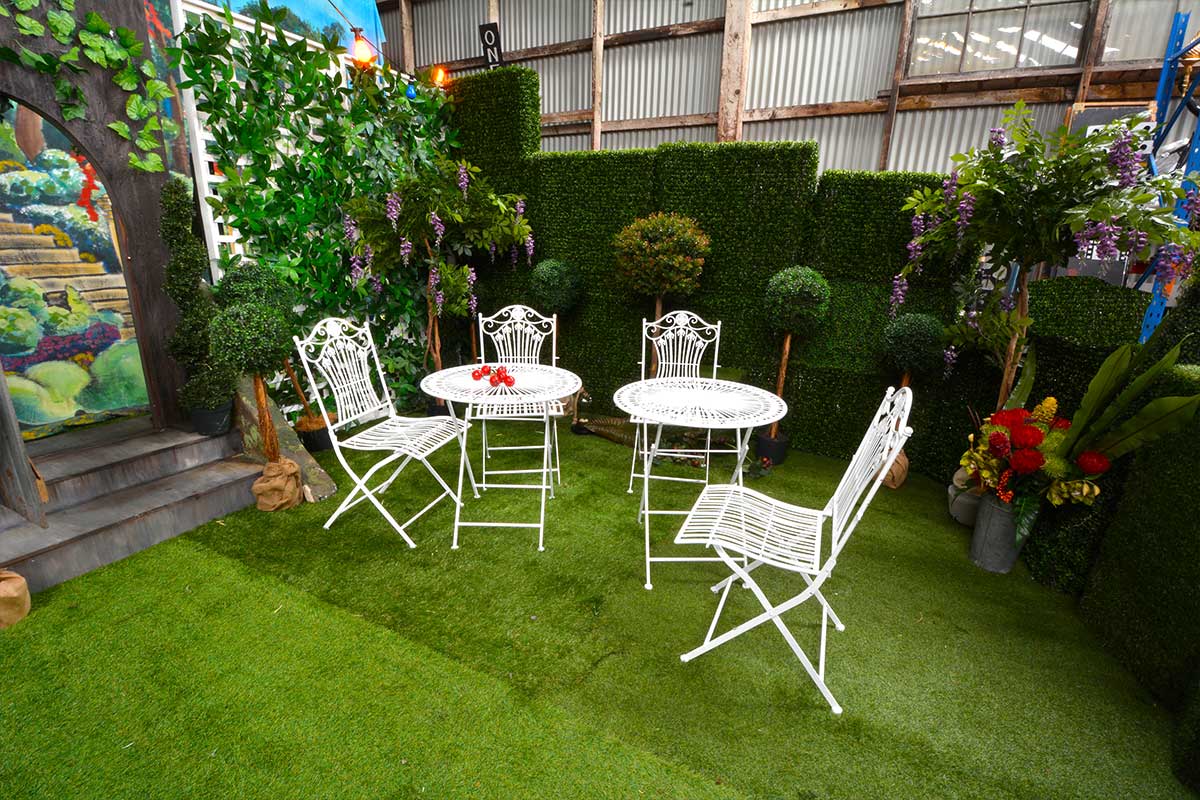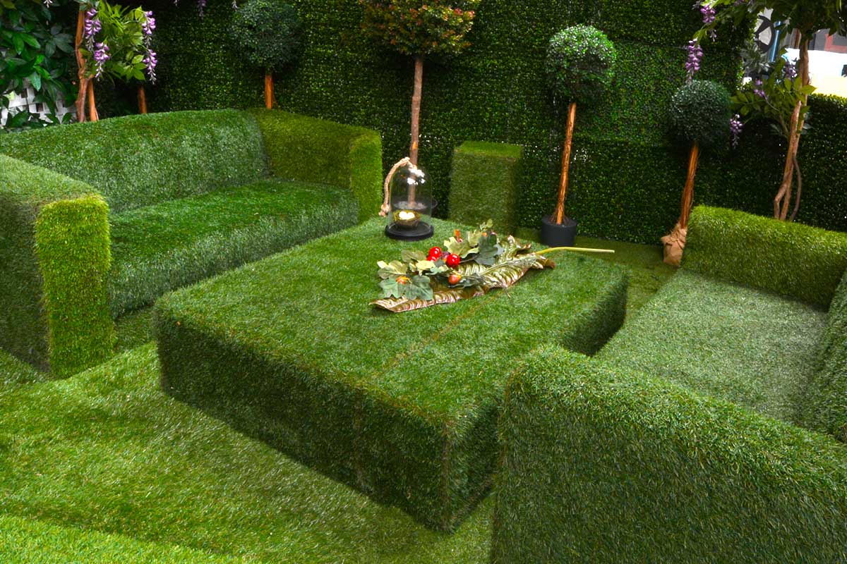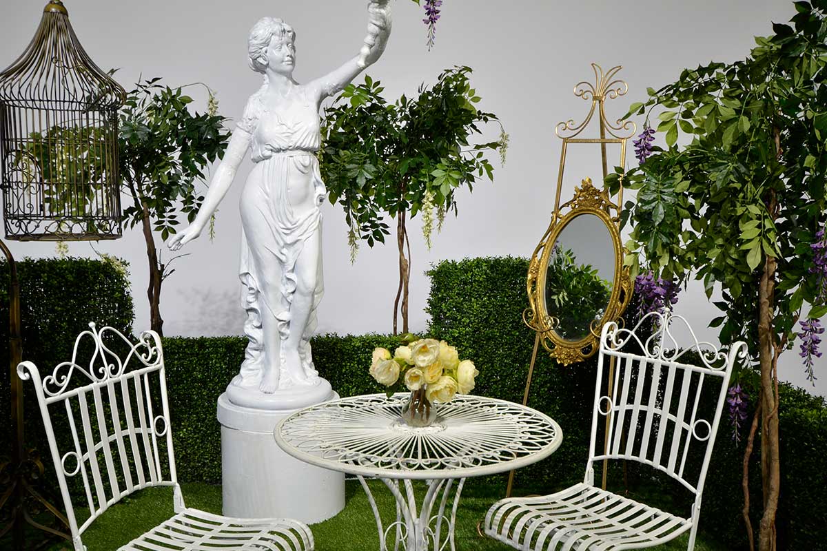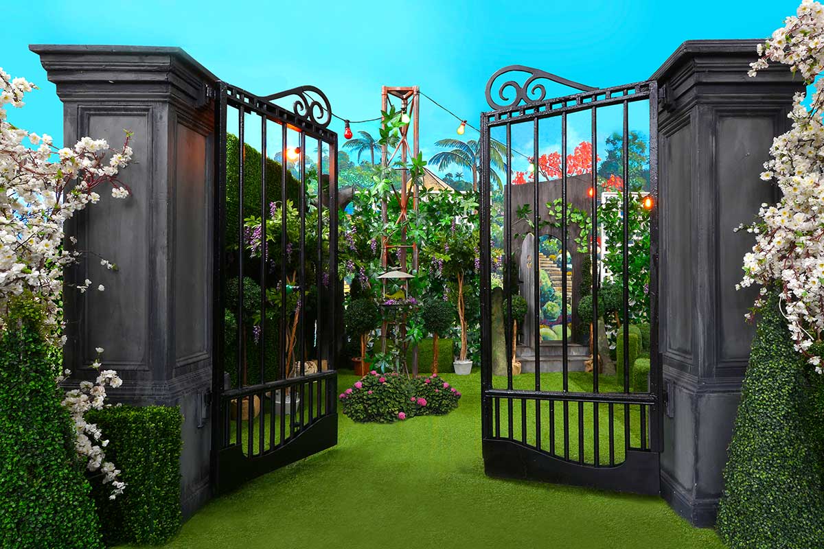 We have the key to unlock the gate – and through them we go, you and I, holding hands as we once more become children, curiosity and anticipation in our eyes – we’re ready to explore. Hey this garden sits on grass – and look, the grass has grown up and over shapes to form furniture. Over there, that’s topiary poking it’s head up – why, they’re everywhere. And hedgerows for walls, how cool! Is that a magical door over there under those hanging garlands?