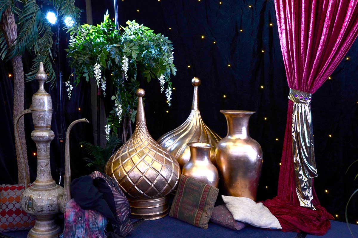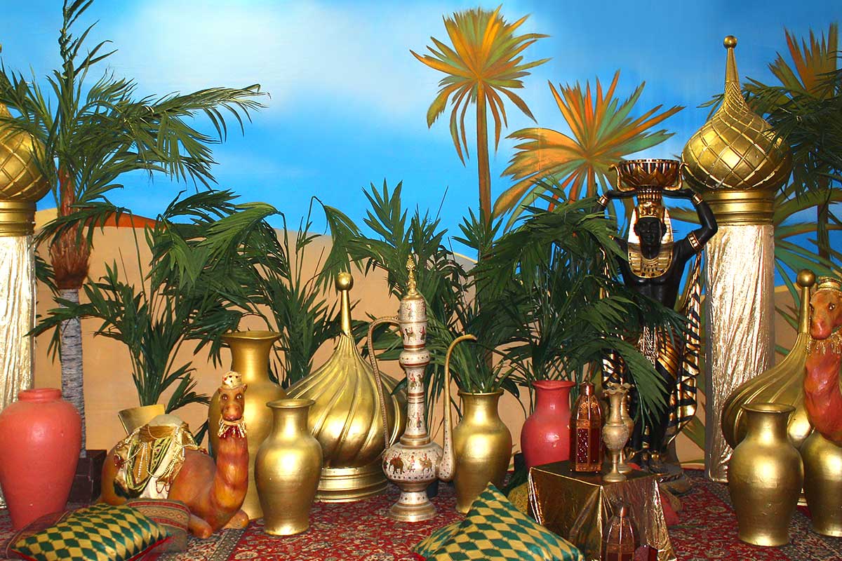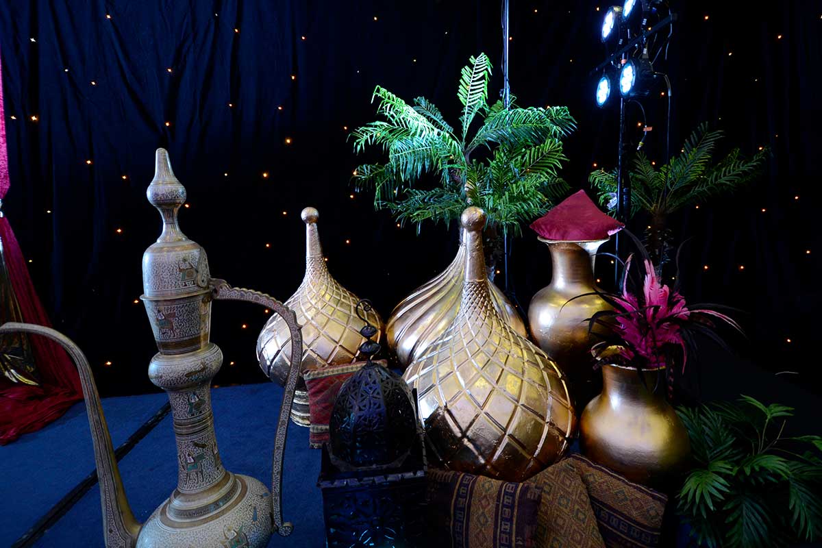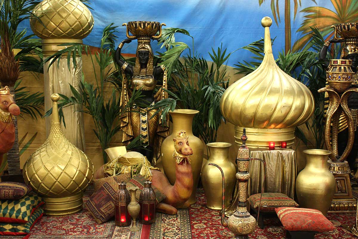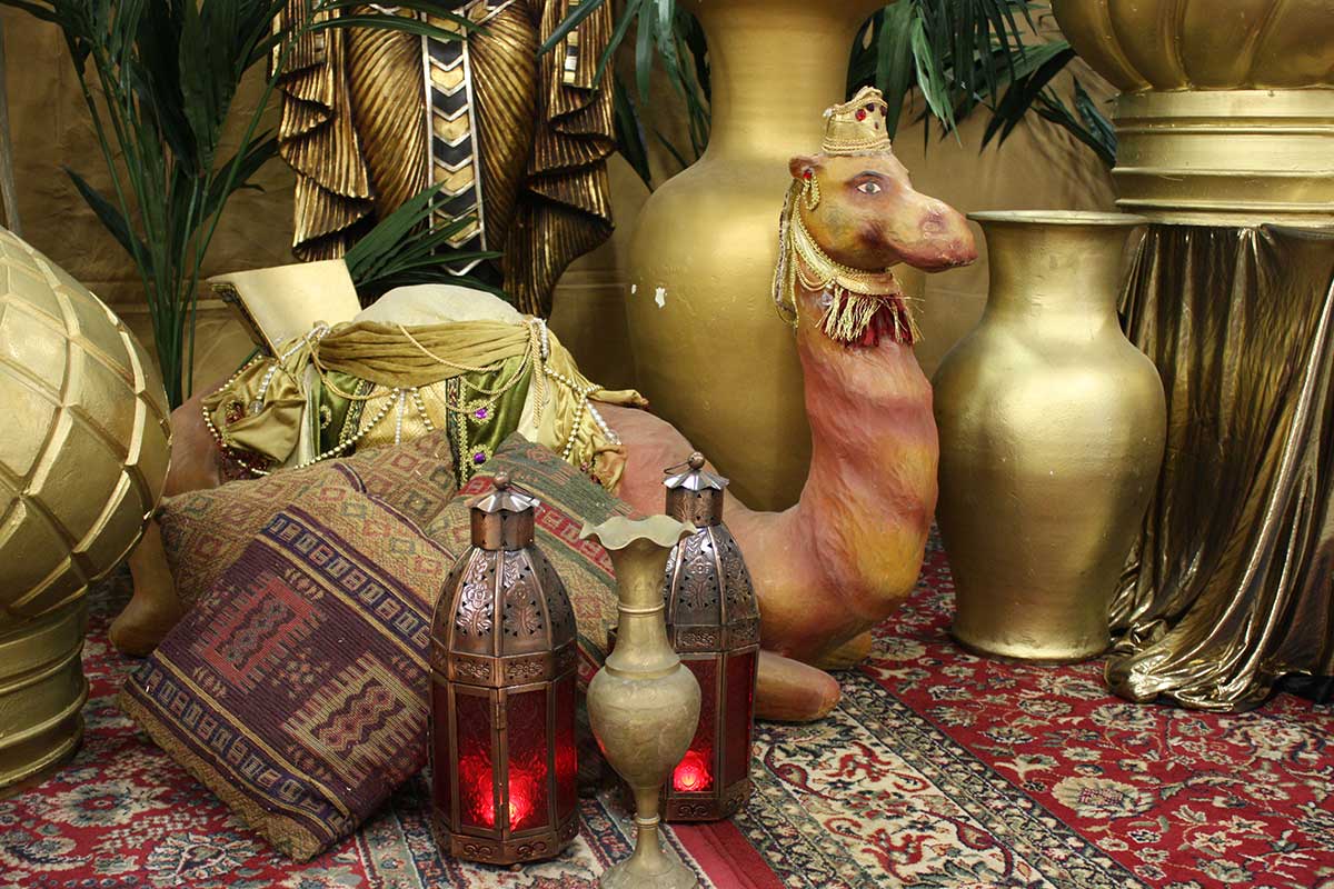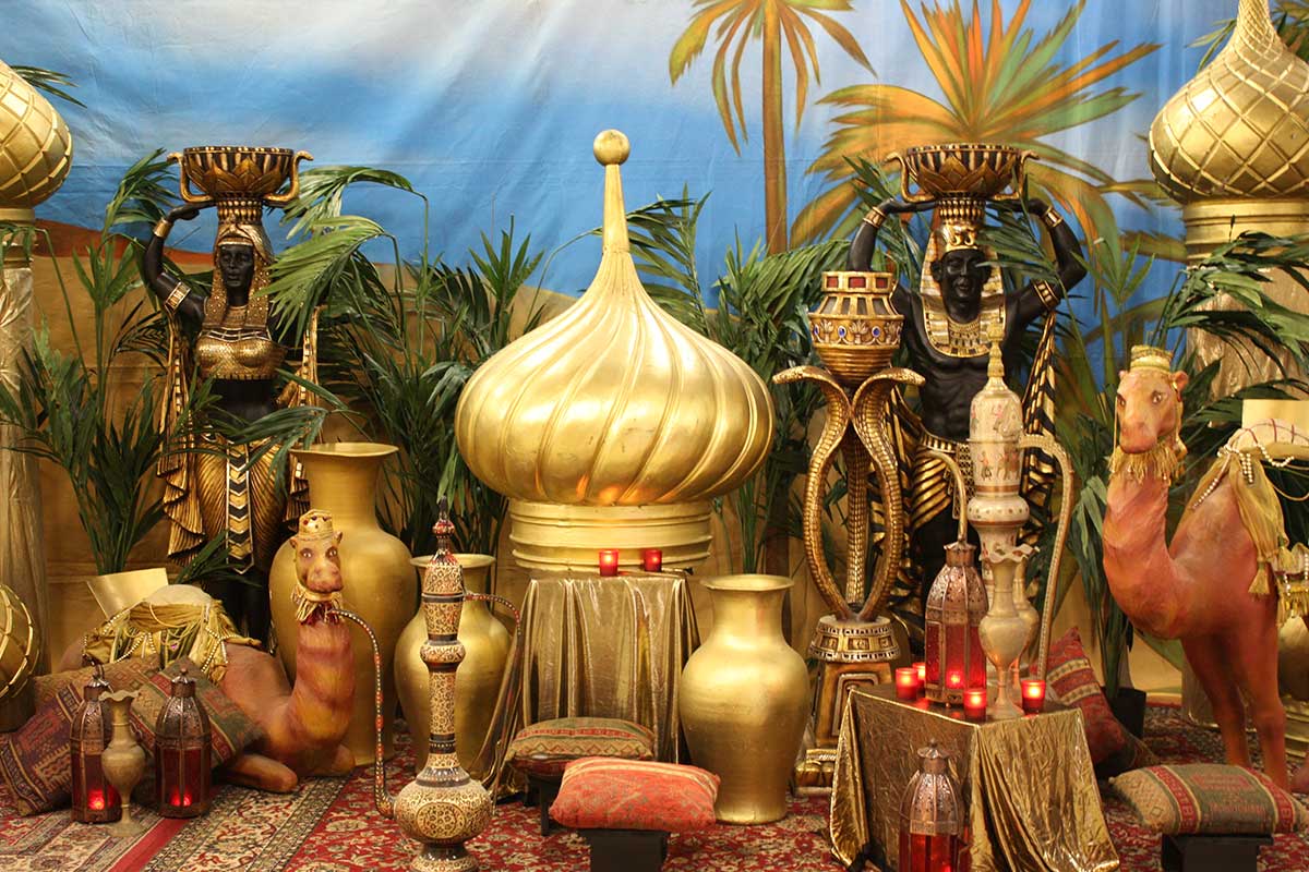 Sydney Props popular Arabian Theme allows for styling both interior and exterior themed environments, not only for corporate and private events, but also photographic shoots, studio productions and theatre. Against Arabian Desert backdrops, find Bedouin tents adorned richly with colourful fabrics. The interiors dressed lavishly with Middle Eastern Decor and props. Selection may include gold urns, pots, columns with minarets, domes, Persian carpets and rugs, aftabas, hookah pipes and cushions. Lamps, baskets, clay jars, statues, musical instruments, assorted palm trees, camel cutouts and glowing lanterns. This styling is ideal for creating a chill out or cocktail area draped with star cloths, where guests can lounge on colourful woven cushions and be fascinated by exotic trinkets. With additional props from our Pirate Theme, our Arabian Theme can be transformed to create an Aladdin’s Cave or a Desert Camp for Ali Baba and his Forty Thieves.
