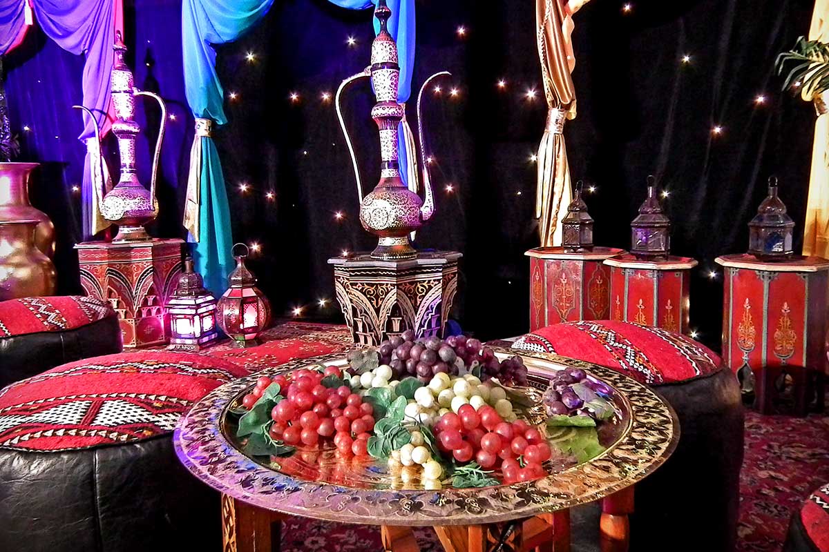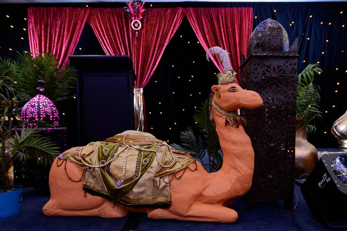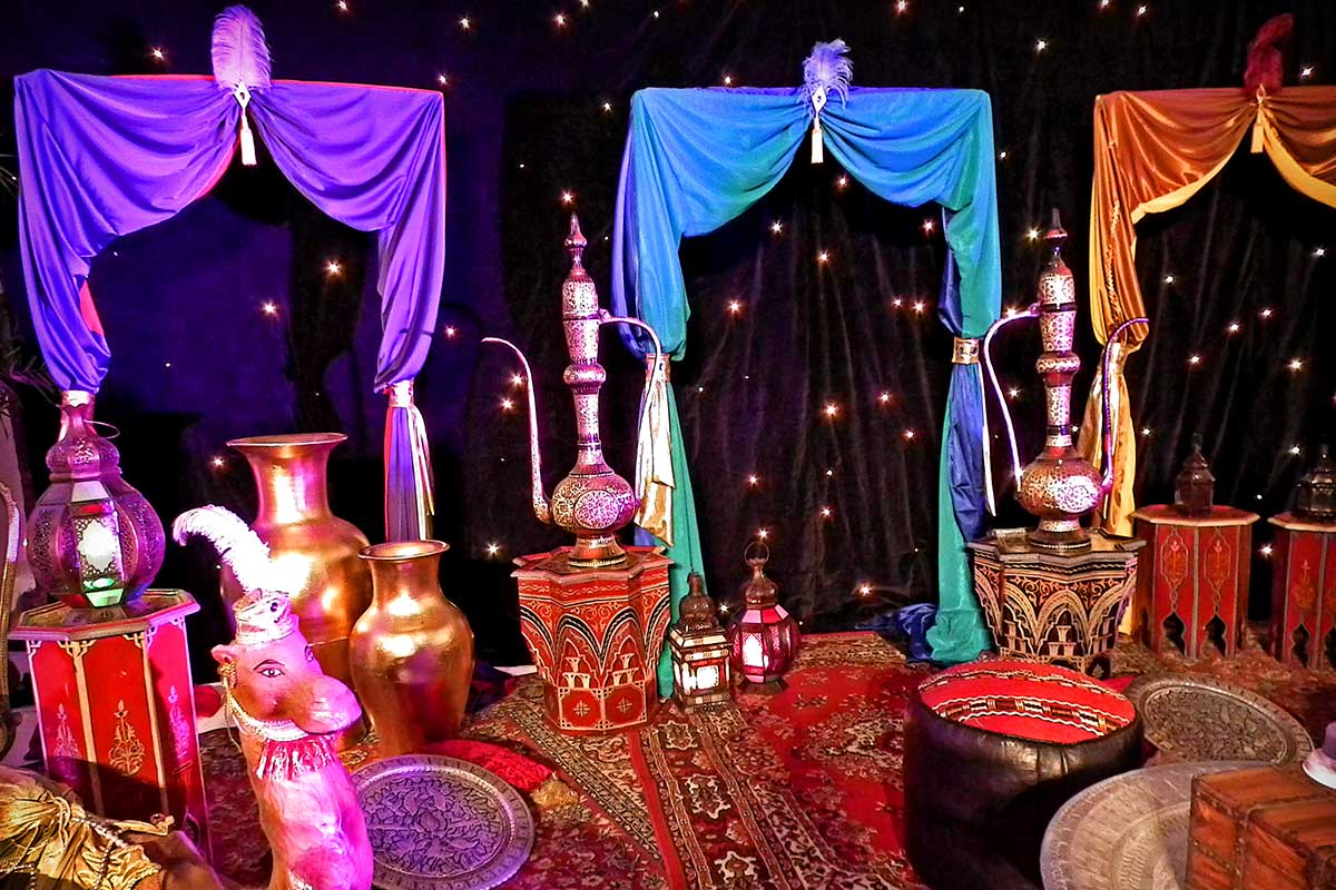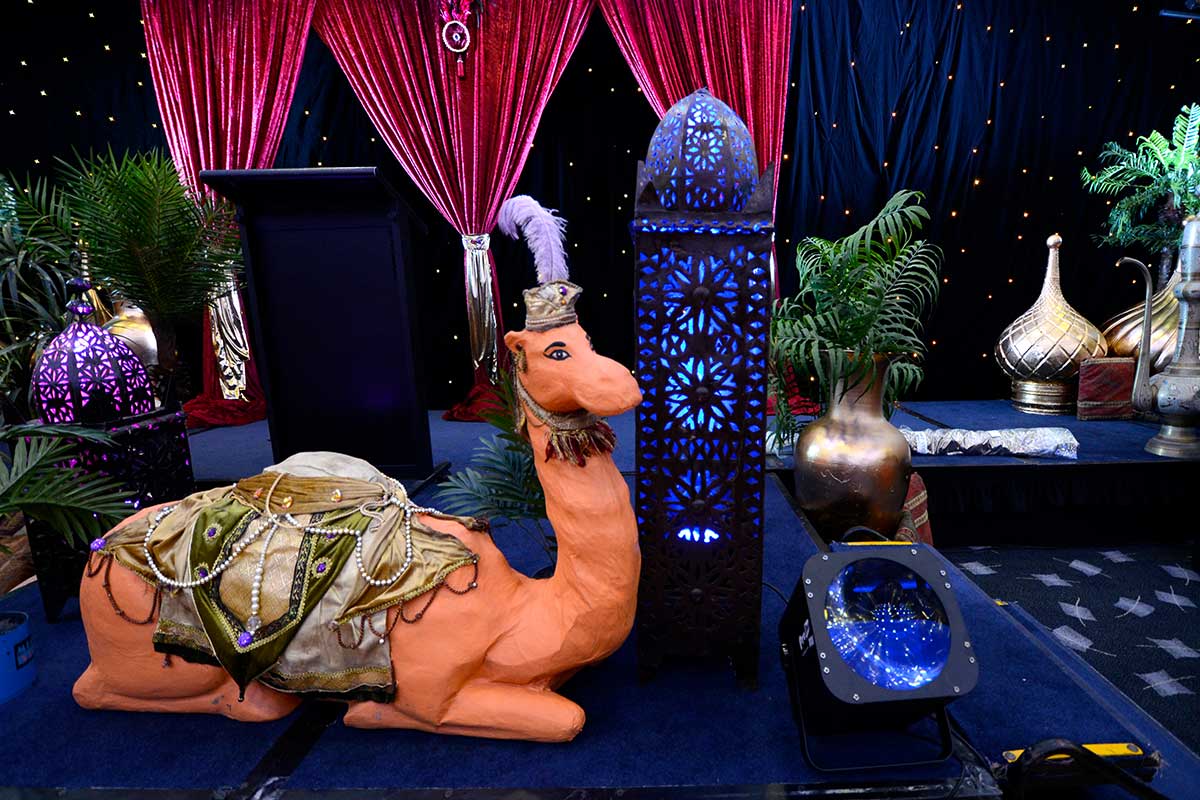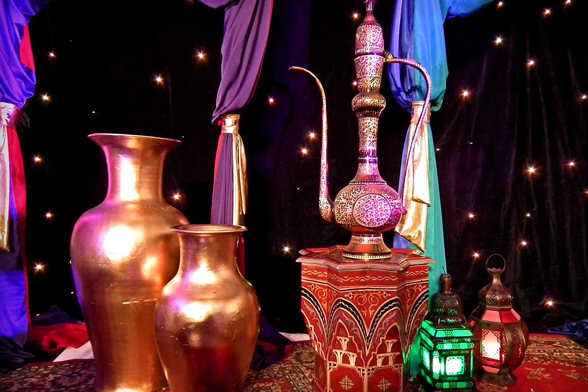 Sydney Props popular Arabian Theme allows for styling both interior and exterior themed environments, not only for corporate and private events, but also photographic shoots, studio productions and theatre. Against Arabian Desert backdrops, find Bedouin tents adorned richly with colourful fabrics. The interiors dressed lavishly with Middle Eastern Decor and props. Selection may include gold urns, pots, columns with minarets, domes, Persian carpets and rugs, aftabas, hookah pipes and cushions. Lamps, baskets, clay jars, statues, musical instruments, assorted palm trees, camel cutouts and glowing lanterns. This styling is ideal for creating a chill out or cocktail area draped with star cloths, where guests can lounge on colourful woven cushions and be fascinated by exotic trinkets. With additional props from our Pirate Theme, our Arabian Theme can be transformed to create an Aladdin’s Cave or a Desert Camp for Ali Baba and his Forty Thieves.