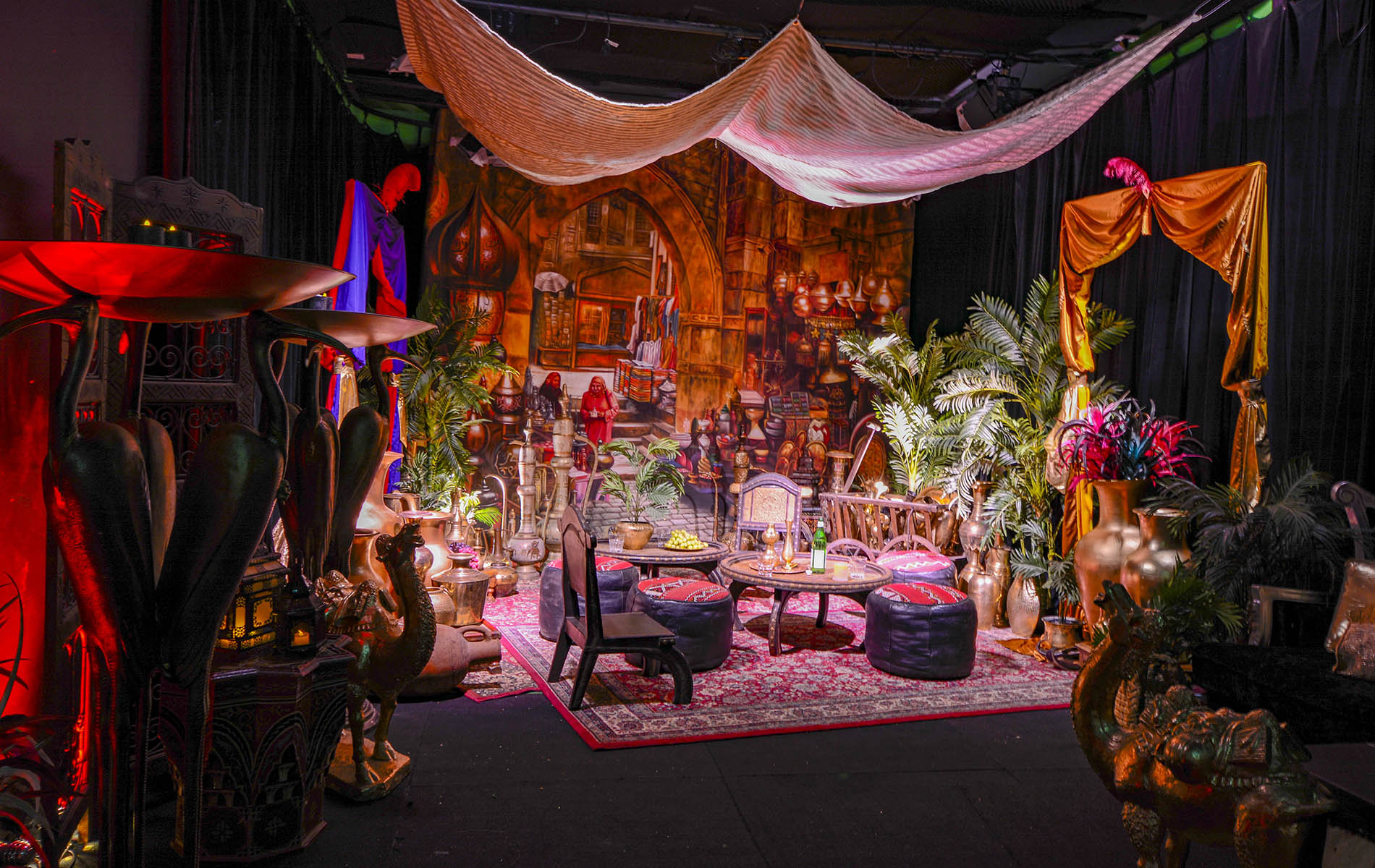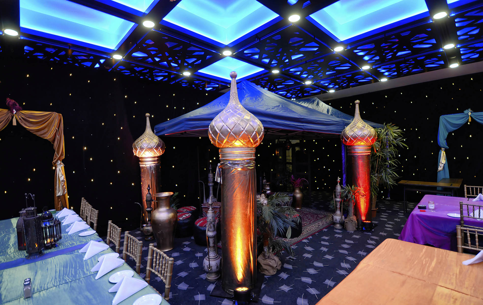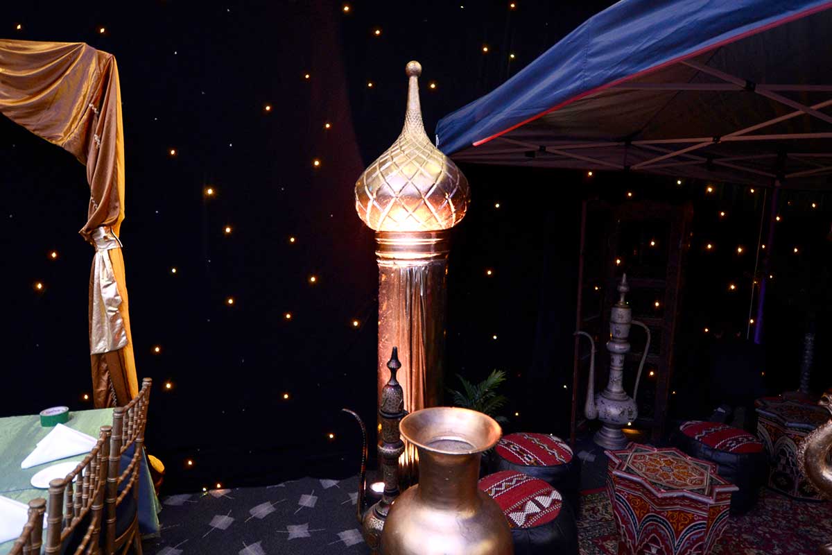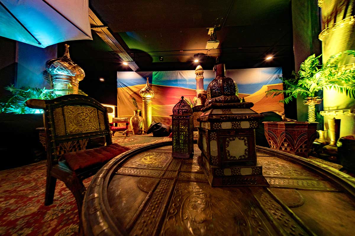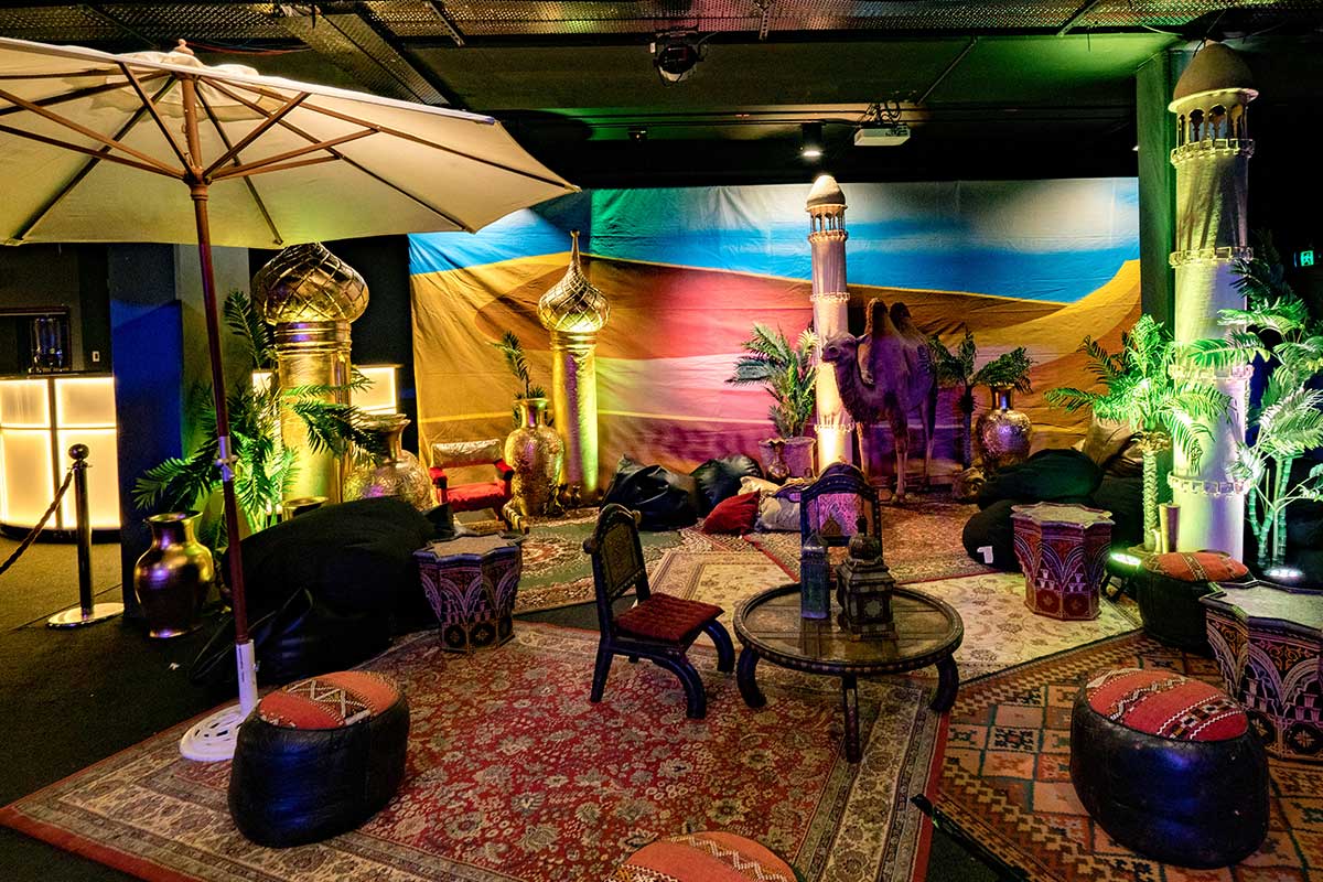 Sydney Props popular Arabian Theme allows for styling both interior and exterior themed environments, not only for corporate and private events, but also photographic shoots, studio productions and theatre. Against Arabian Desert backdrops, find Bedouin tents adorned richly with colourful fabrics. The interiors dressed lavishly with Middle Eastern Decor and props. Selection may include gold urns, pots, columns with minarets, domes, Persian carpets and rugs, aftabas, hookah pipes and cushions. Lamps, baskets, clay jars, statues, musical instruments, assorted palm trees, camel cutouts and glowing lanterns. This styling is ideal for creating a chill out or cocktail area draped with star cloths, where guests can lounge on colourful woven cushions and be fascinated by exotic trinkets. With additional props from our Pirate Theme, our Arabian Theme can be transformed to create an Aladdin’s Cave or a Desert Camp for Ali Baba and his Forty Thieves.
