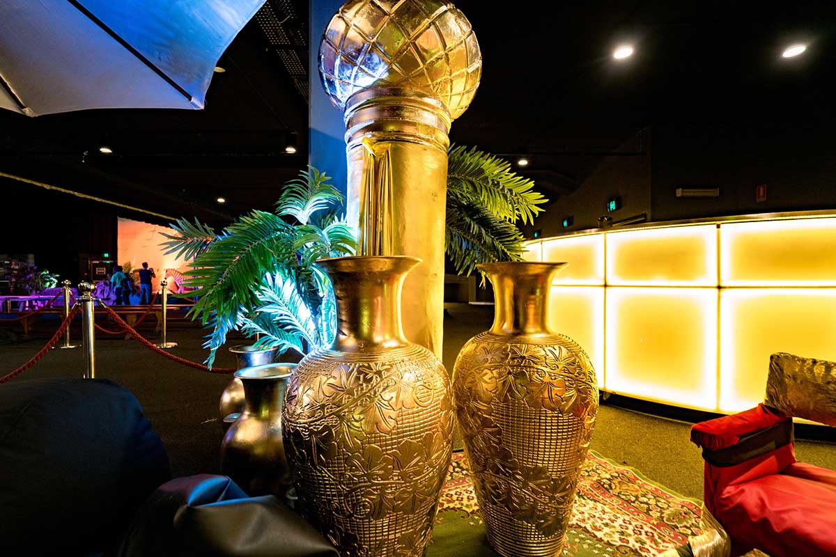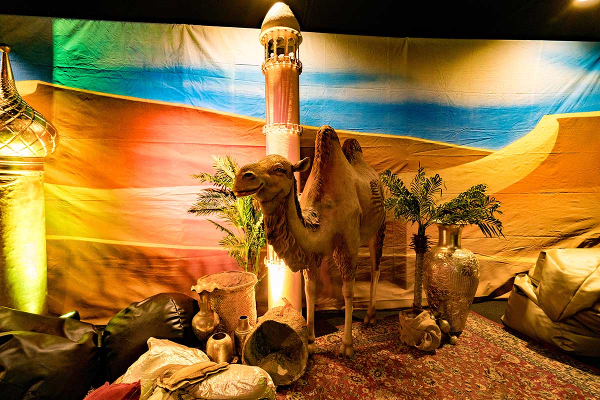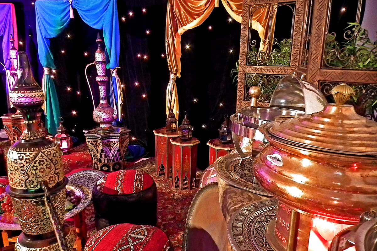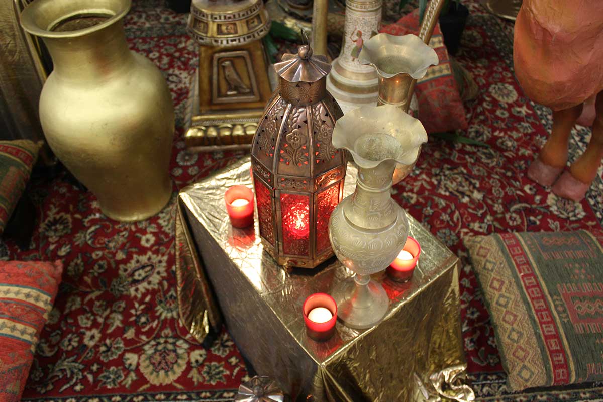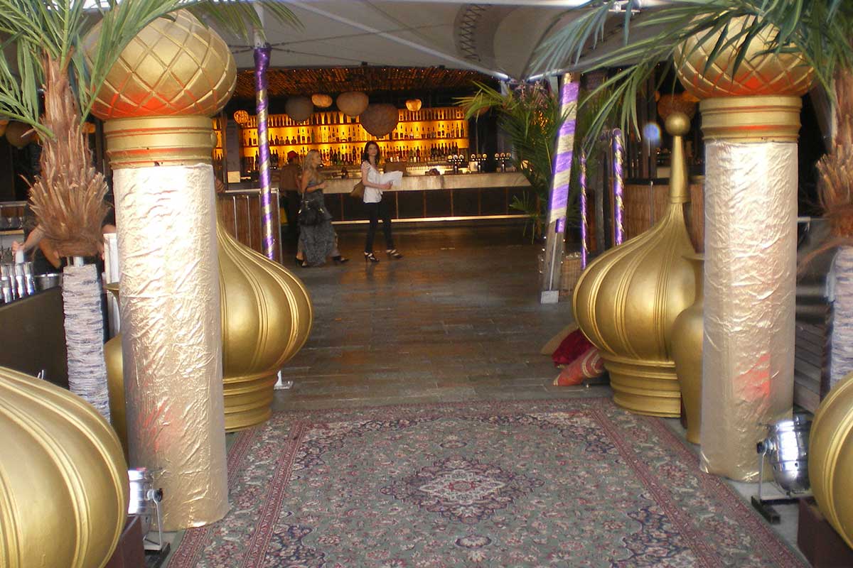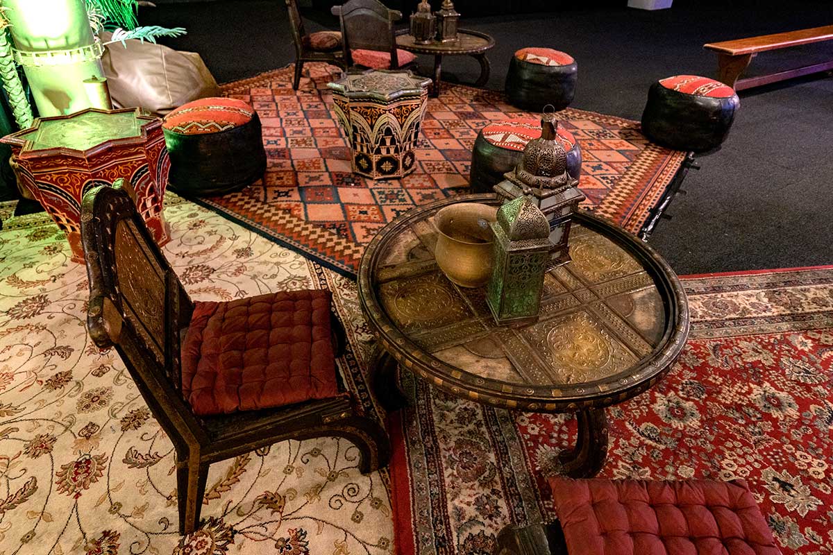 Sydney Props popular Arabian Theme allows for styling both interior and exterior themed environments, not only for corporate and private events, but also photographic shoots, studio productions and theatre. Against Arabian Desert backdrops, find Bedouin tents adorned richly with colourful fabrics. The interiors dressed lavishly with Middle Eastern Decor and props. Selection may include gold urns, pots, columns with minarets, domes, Persian carpets and rugs, aftabas, hookah pipes and cushions. Lamps, baskets, clay jars, statues, musical instruments, assorted palm trees, camel cutouts and glowing lanterns. This styling is ideal for creating a chill out or cocktail area draped with star cloths, where guests can lounge on colourful woven cushions and be fascinated by exotic trinkets. With additional props from our Pirate Theme, our Arabian Theme can be transformed to create an Aladdin’s Cave or a Desert Camp for Ali Baba and his Forty Thieves.