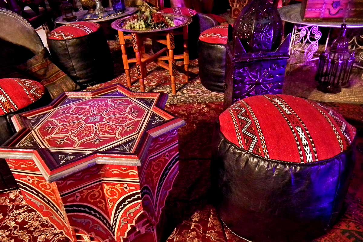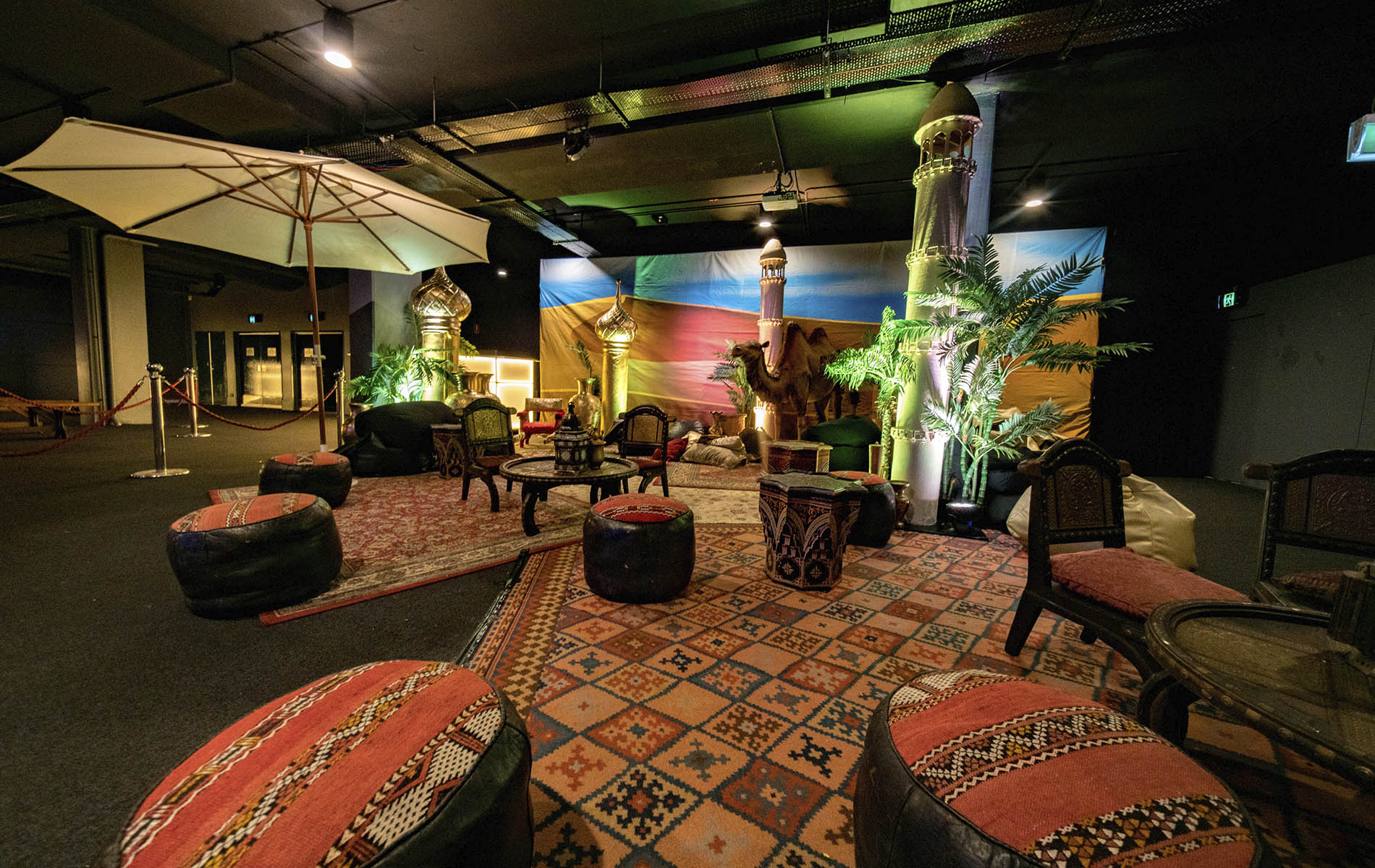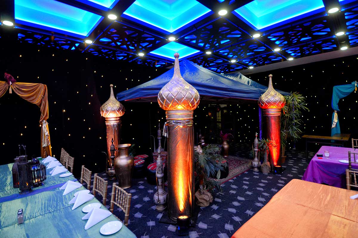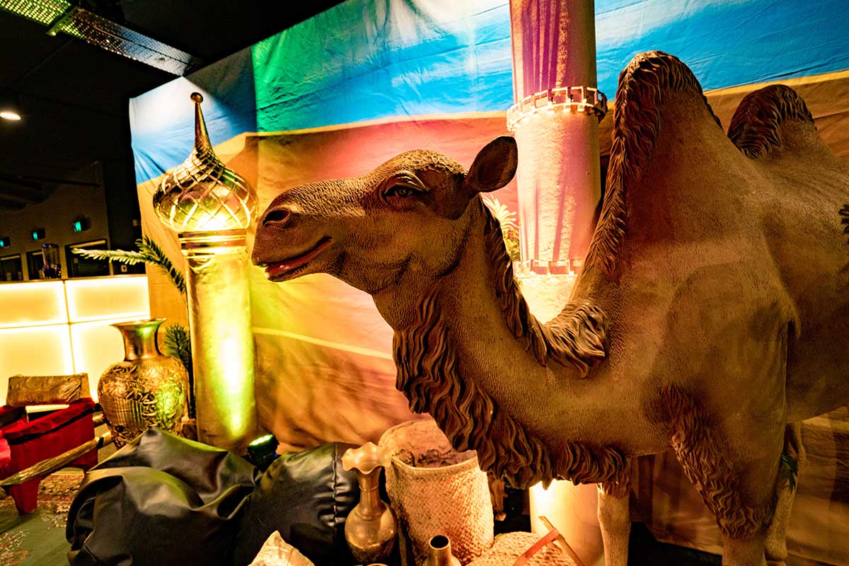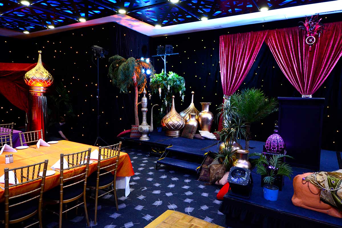 Sydney Props popular Arabian Theme allows for styling both interior and exterior themed environments, not only for corporate and private events, but also photographic shoots, studio productions and theatre. Against Arabian Desert backdrops, find Bedouin tents adorned richly with colourful fabrics. The interiors dressed lavishly with Middle Eastern Decor and props. Selection may include gold urns, pots, columns with minarets, domes, Persian carpets and rugs, aftabas, hookah pipes and cushions. Lamps, baskets, clay jars, statues, musical instruments, assorted palm trees, camel cutouts and glowing lanterns. This styling is ideal for creating a chill out or cocktail area draped with star cloths, where guests can lounge on colourful woven cushions and be fascinated by exotic trinkets. With additional props from our Pirate Theme, our Arabian Theme can be transformed to create an Aladdin’s Cave or a Desert Camp for Ali Baba and his Forty Thieves.
