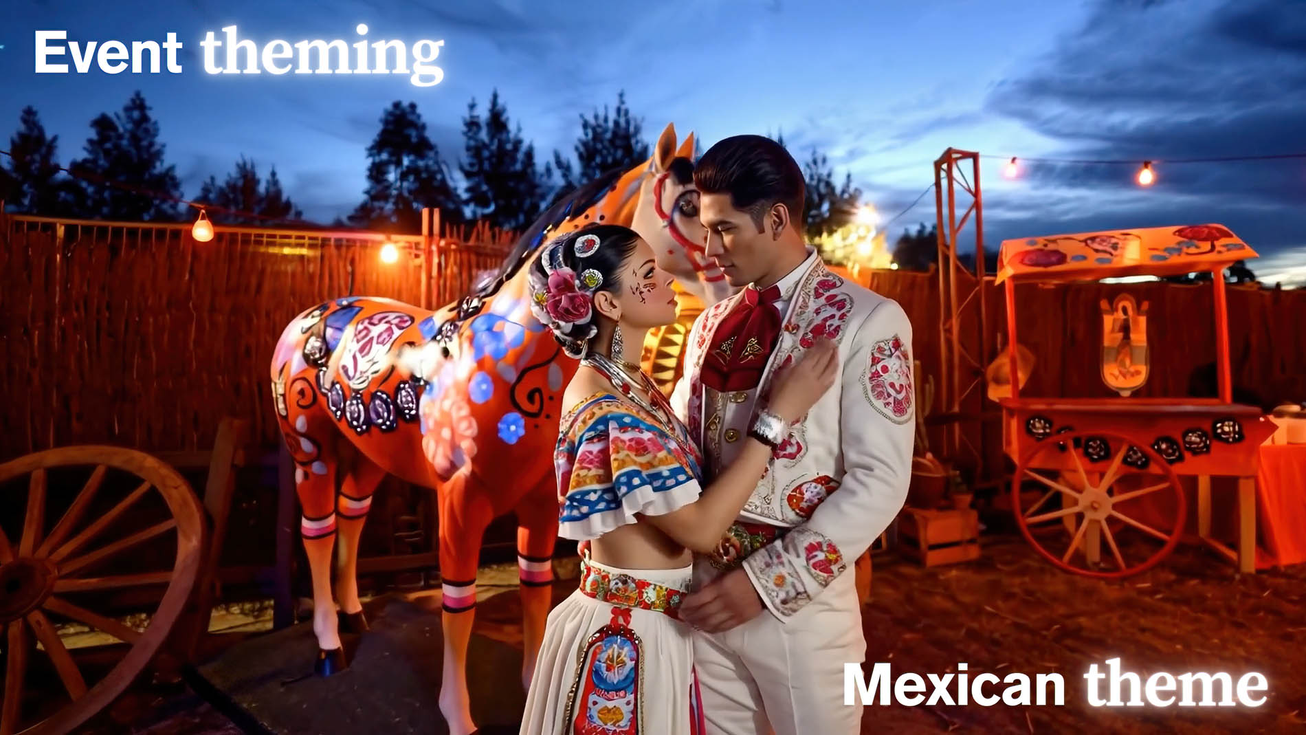 Simply fill your venue space with a selection of Mexican style props and decorative elements such as brightly hand painted vases and urns, metal ware, wall hangings, religious iconography and carved animals, as well as wooden barrels, stacked haybales and strings of festoon lighting.  A colourful Mexican style service cart and handpainted full size Mexican horse add to the fun of the theme, whilst simple rustic furniture comfortably accomodates your guests. This theme is always a hit and a popular choice for private events and special occasion. Always colourful during the day and absolutely stunning by night!