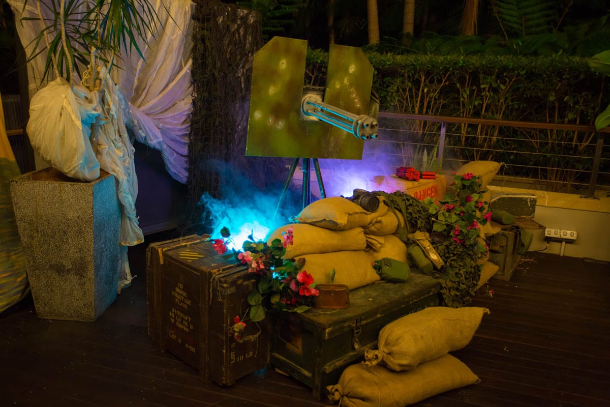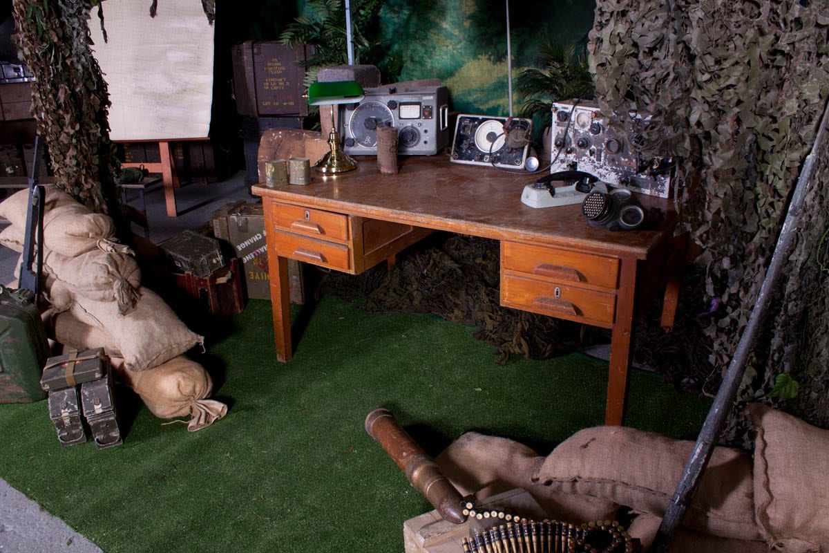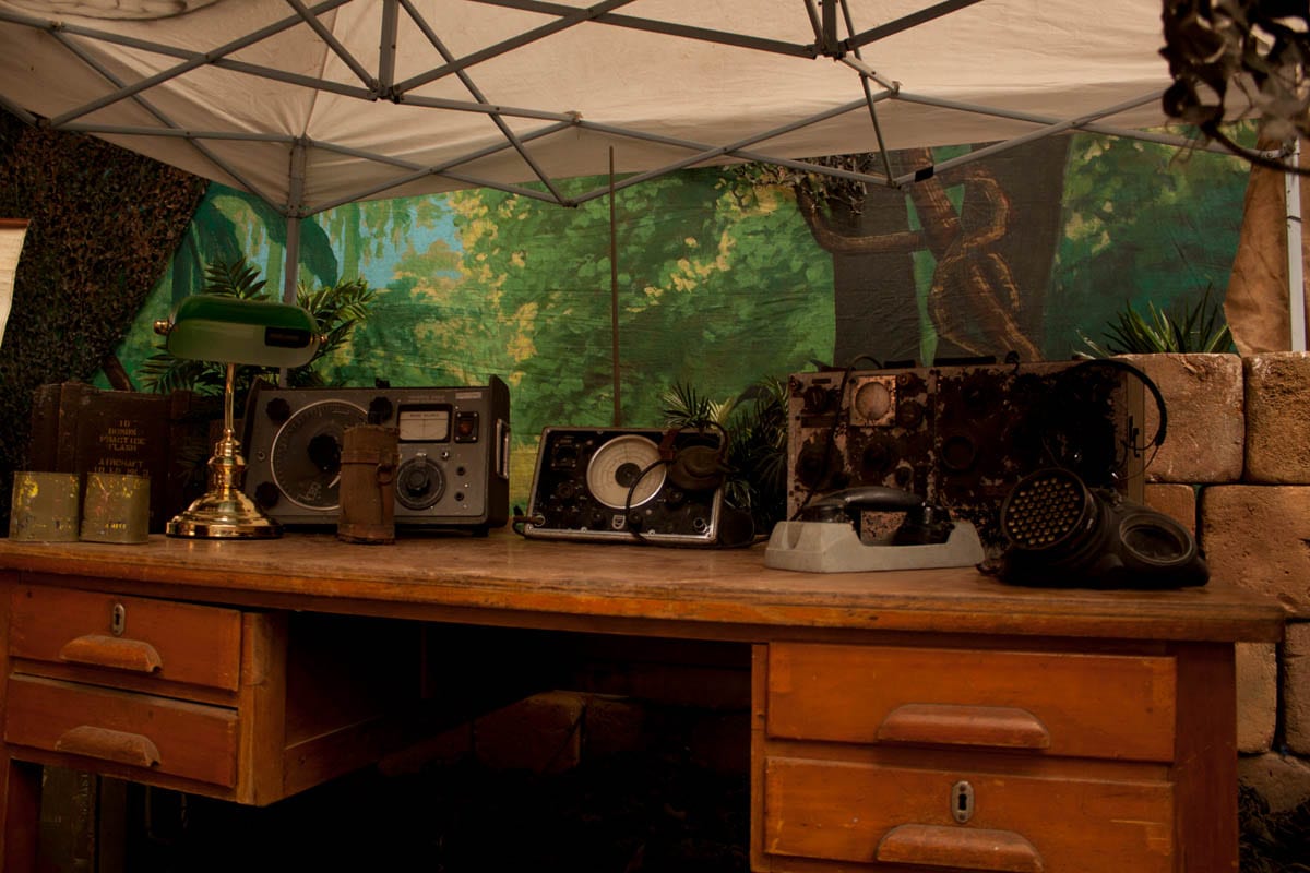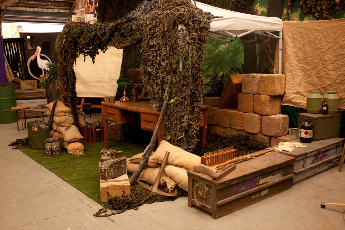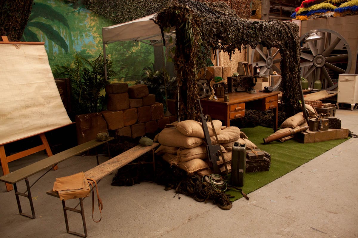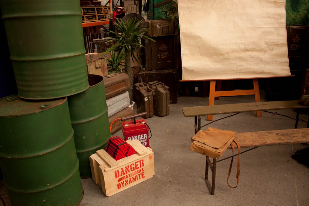 Our army theme sets the scene – a command post last century; tents and camouflage netting, sandbags and canisters, jerry cans, crates and boxes, ordinance, first aid equipment and large industrial fan set pieces. In the background we see jungle backdrops and foliage.