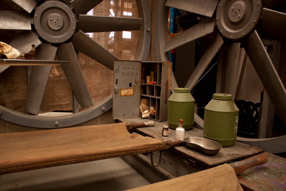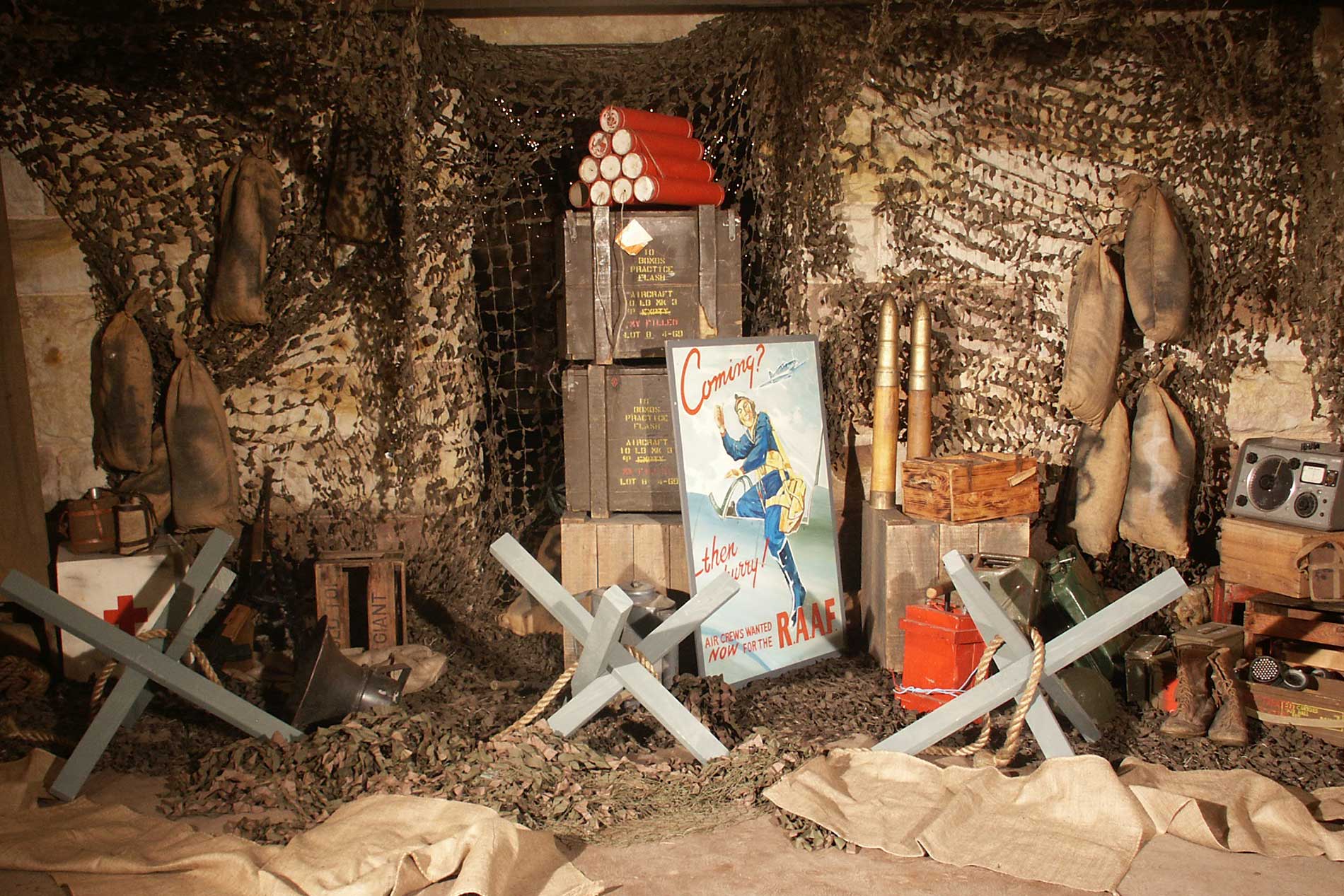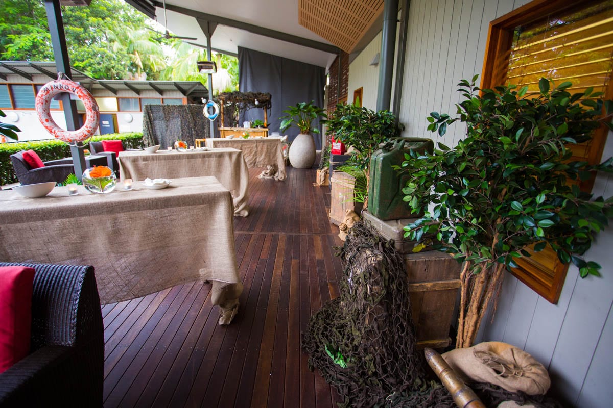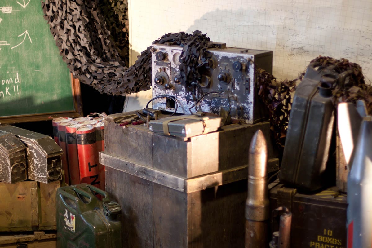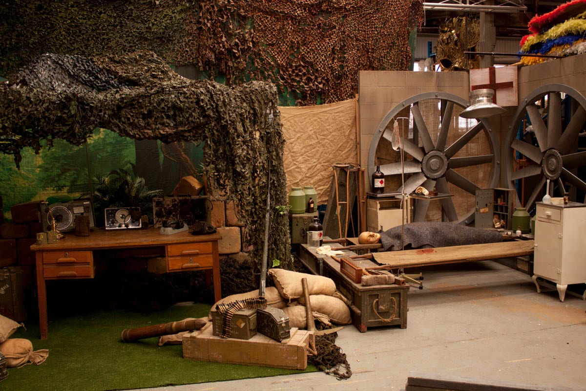 Our army theme sets the scene – a command post last century; tents and camouflage netting, sandbags and canisters, jerry cans, crates and boxes, ordinance, first aid equipment and large industrial fan set pieces. In the background we see jungle backdrops and foliage.