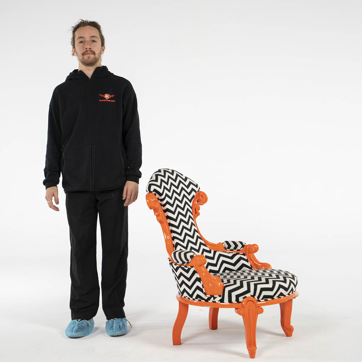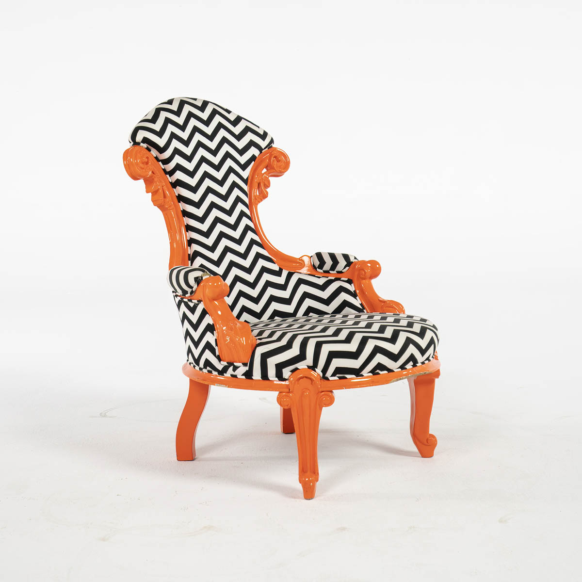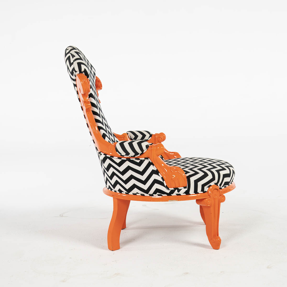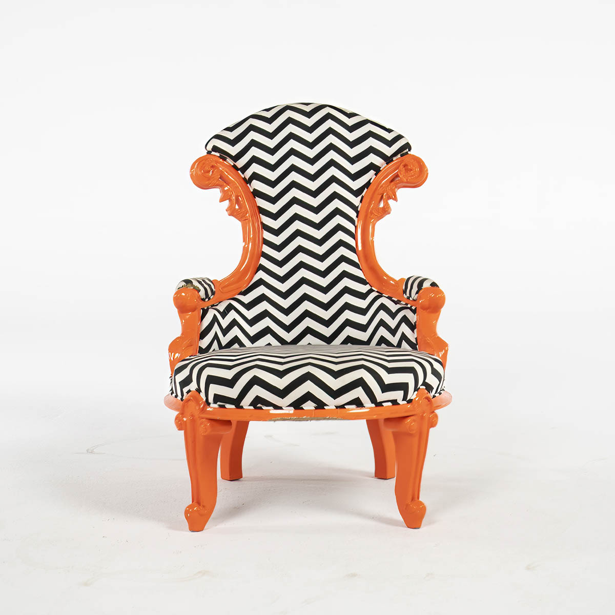 Alice Chair – Black and white zig-zag pattern on cushion seat, back and armrest with orange coloured frame.