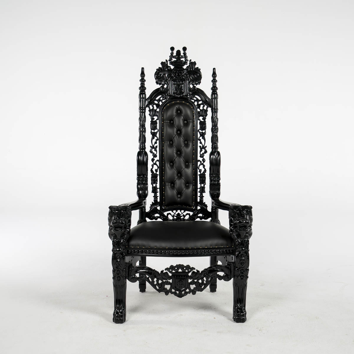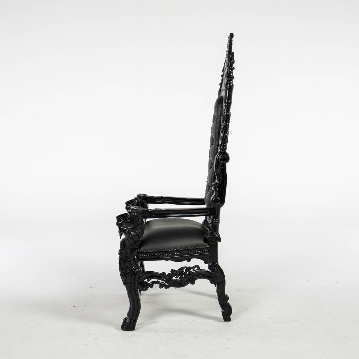 Black Throne - ornate high back cushioned throne. throne frame and material all in black colour.