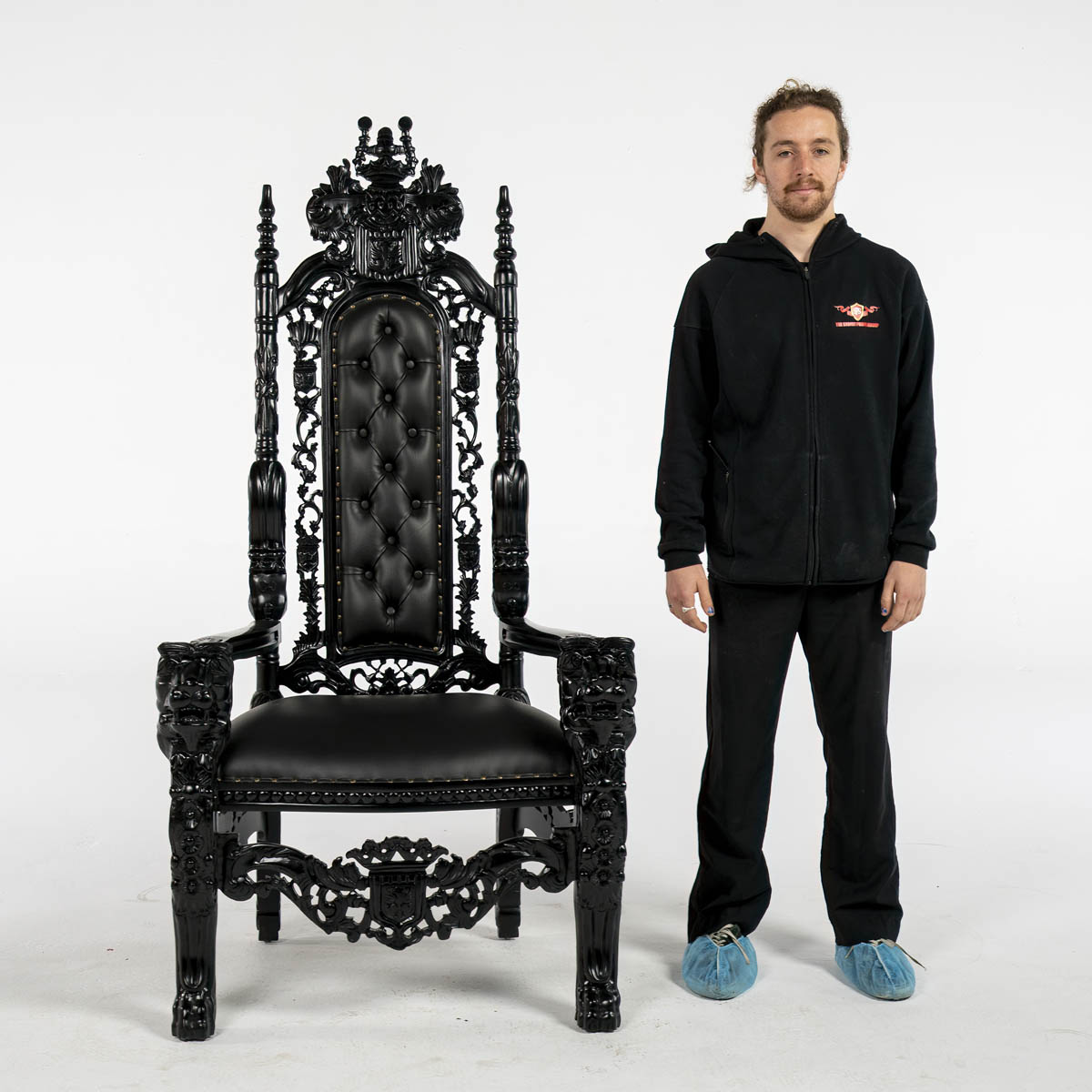 Black Throne – ornate high back cushioned throne. throne frame and material all in black colour.