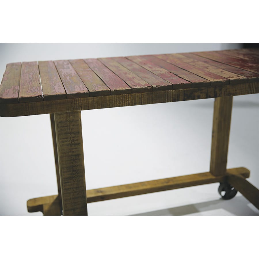 Features rustic painted red timber with one directional wheels (they do not swivel). Great for use as bar service, display or table.