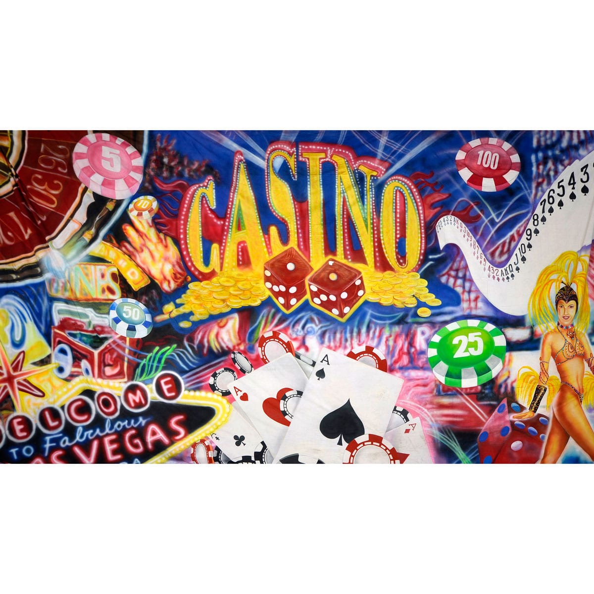 Depicting Casino Sign, Money, Dice, Roulette Wheel, Showgirls, Cards and Chips