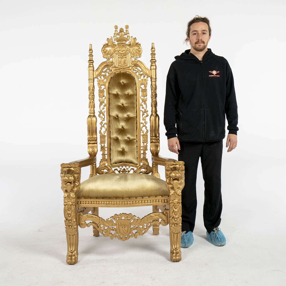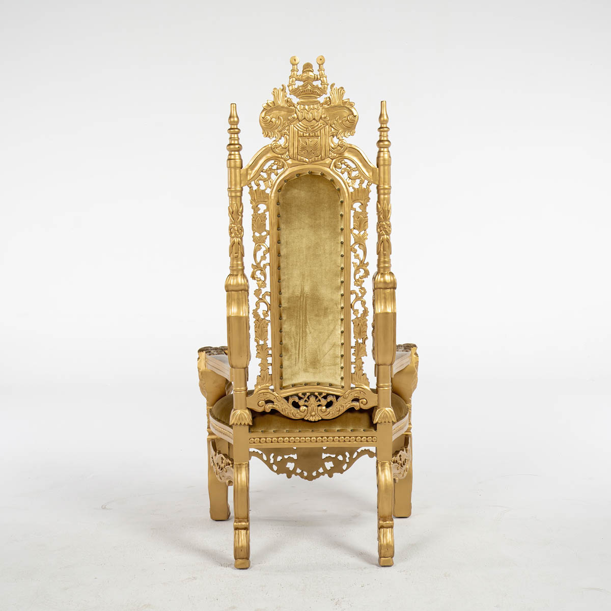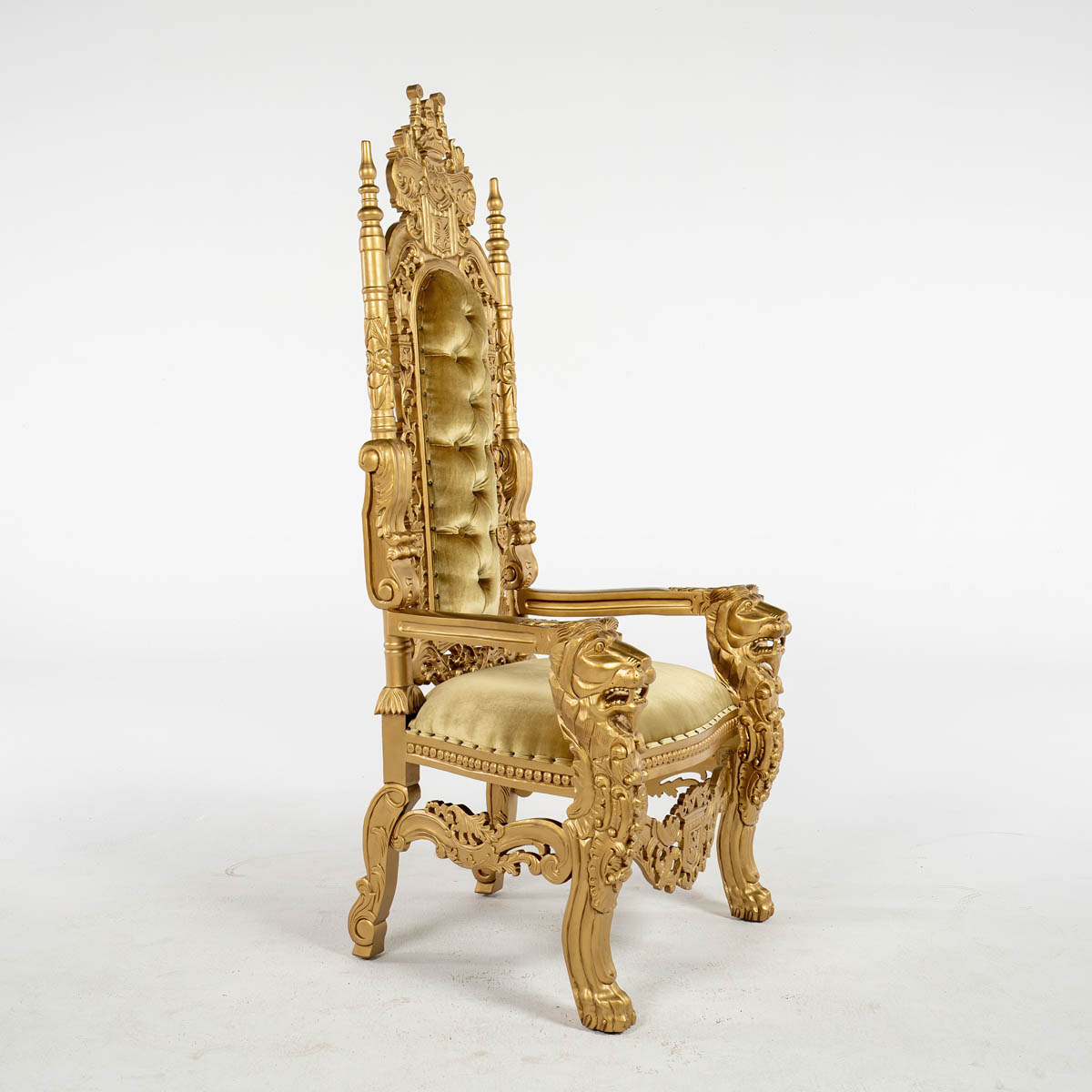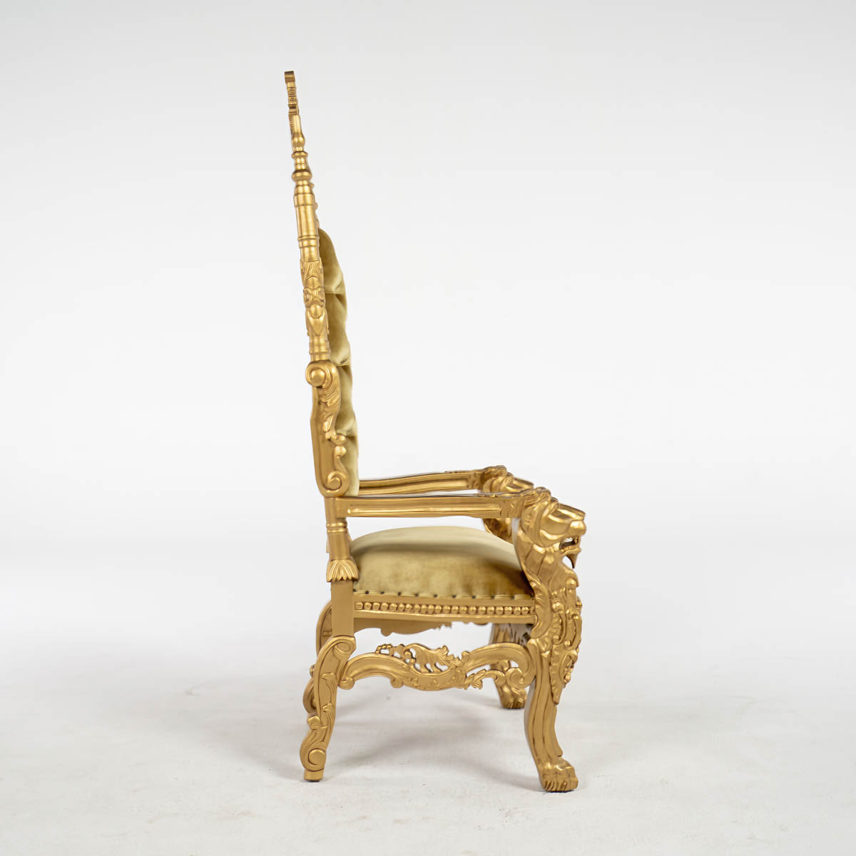 Gold Throne - ornate high back cushioned throne. throne frame and material all in gold colour.