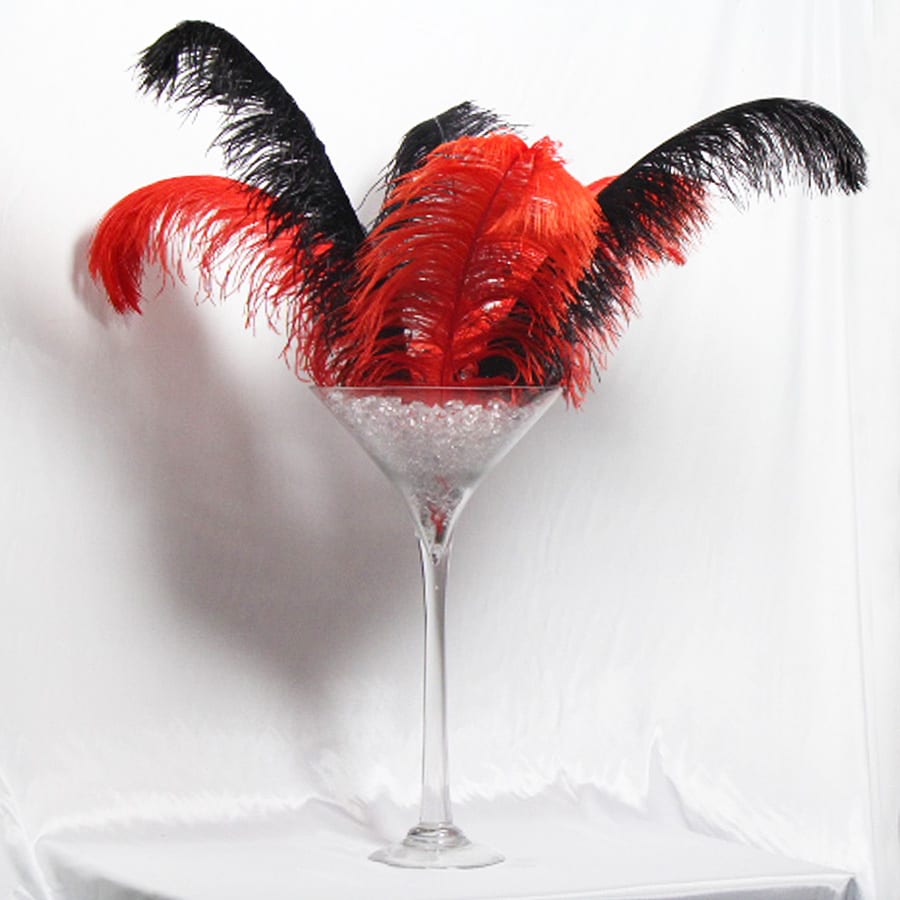 Includes: martini glass, crystal and assorted feathers (centrepiece may vary from photo)