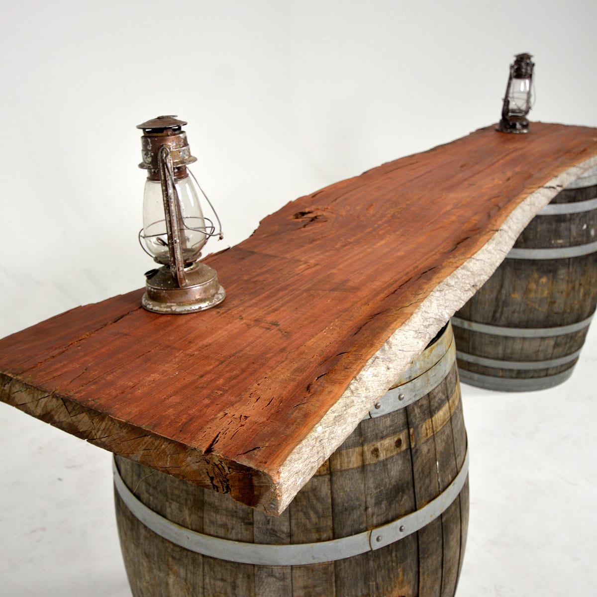 Raw Timber Table Top on Two Barrels - prop / event decor for hire