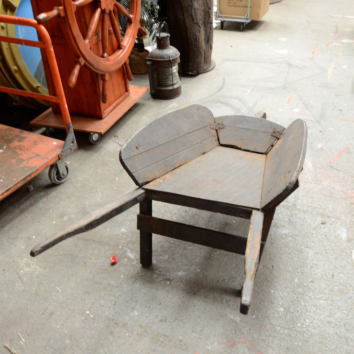 Rustic wooden wheelbarrow with metal wheel, sturdy timber legs.