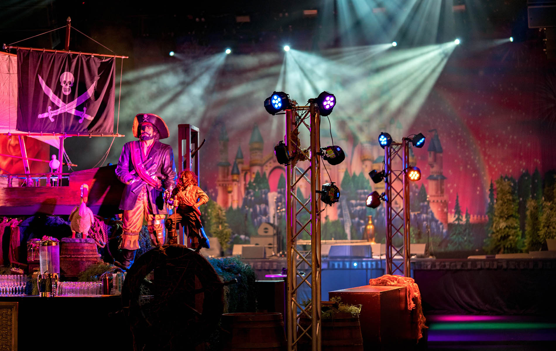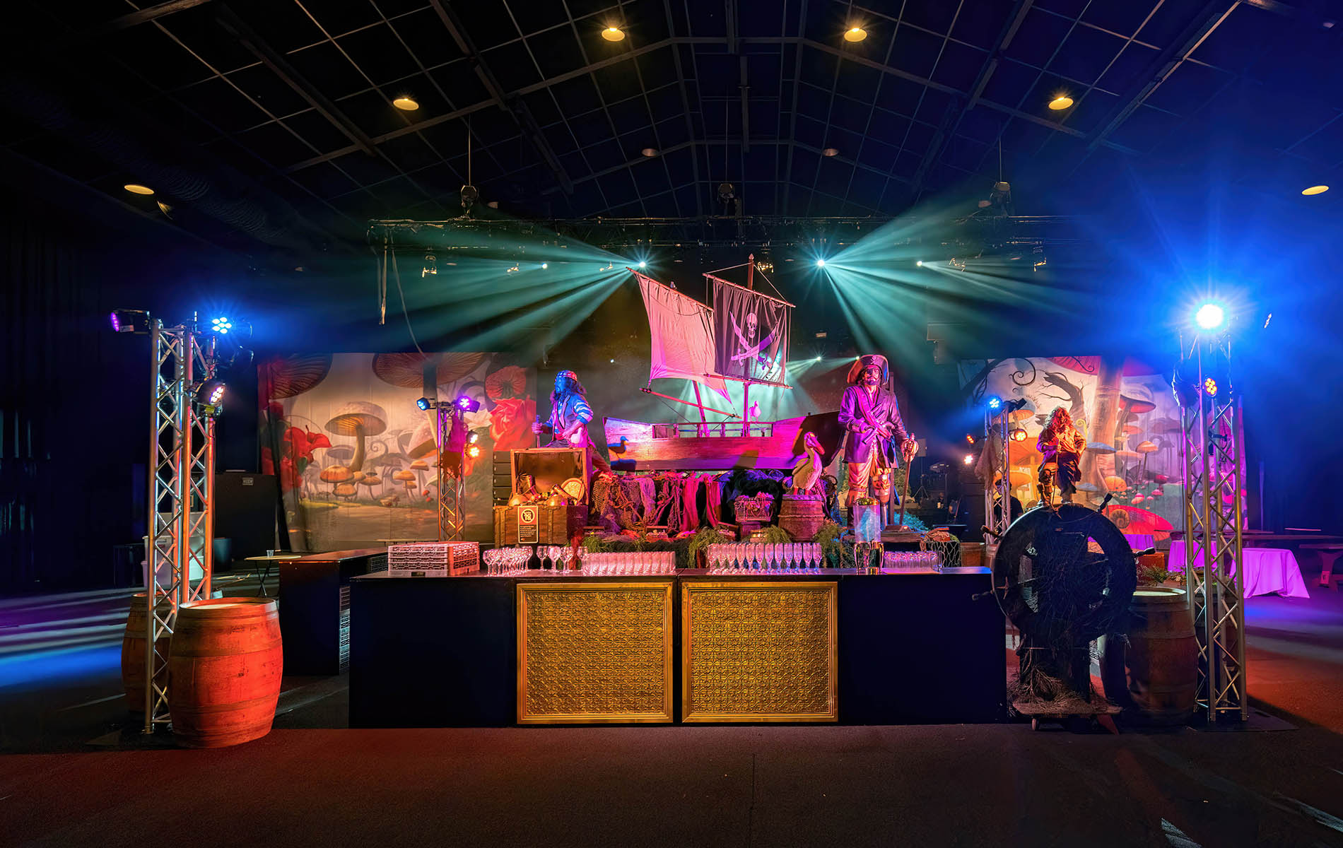 Shiver me timbers me hearties! This is one of our most popular event themes where we can create a tropical cove; with a beach that transitions to a jungle setting where banquet tables await your guests. Sea faring buccaneers cordially escort your guests through a tunnel entrance that leads to a hidden pirate cove, revealing a cocktail bar adorned with stolen treasure, sumptuous delights and exotic fruits. Guests and party goers can find their sea legs and dance a jig on the dance floor decked with cannons, wooden wine barrels, whilst a life size pirate captain statue keeps a lookout from the helm. Other Pirate and Nautical Themed props including ropes, chains, bollards, ships wheel, anchors, assorted treasures chest and of course a skull and crossbones pirate flag add to the decor of the setting.